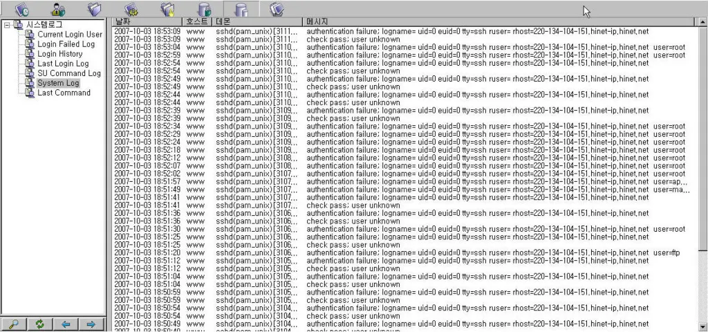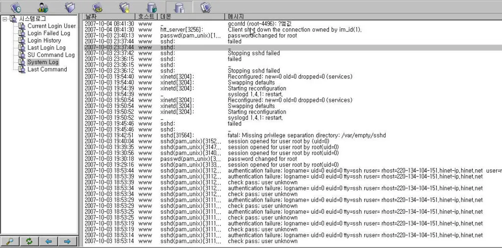 먼저 외부로부터의 어떤 접속이 있었는지의 확인을 위해 RedCastle의 로그인 통제에 대한 감사로그를 확인하였으나 며칠 전 발생했던 /usr 파일시스템의 full로 인한 장애로 RedCastle의 “로그인 서비스 접근 통제 기능”을 잠시 off 하여둔 상태였다. 따라서 RedCastle의 감사로그에는 ssh 접근 기록이 없어 운영체제의 syslog를 확인하였고 단서가 될만한 로그를 확인하였다.