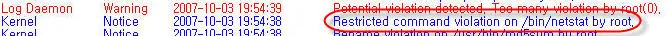 운영체제의 주요 파일들에 대한 위/변조 시도가 모두 차단되자 해커는 서버의 상태를 확인해보고자 netstat와 같은 명령어의 실행을 시도한다. 하지만 이 명령어도 직접 로그인한 root 계정에서는 실행하지 못하도록 한 보안정책에 위반되어 실행이 차단되고 감사 로그가 남겨졌다.