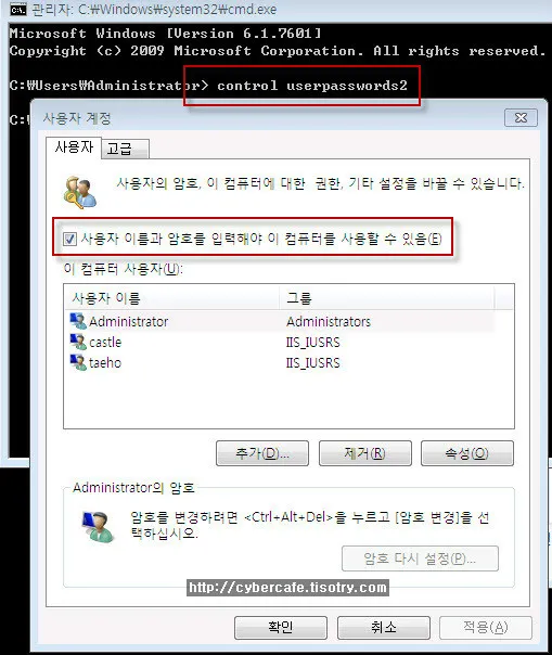 이 문제를 해결하기 위해서는 윈도에 계정을 만들 때 사용자의 그룹을 IIS_IUSRS 로 지정하면 됩니다. 윈도 7의 경우 IIS_IUSRS 그룹으로 지정하면 제어판의 계정관리와 PC를 리부팅 후 처음 로그인할 때 새로 만든 계정은 로컬로그인 권한이 없기 때문에 아예 보이지 않게 됩니다.