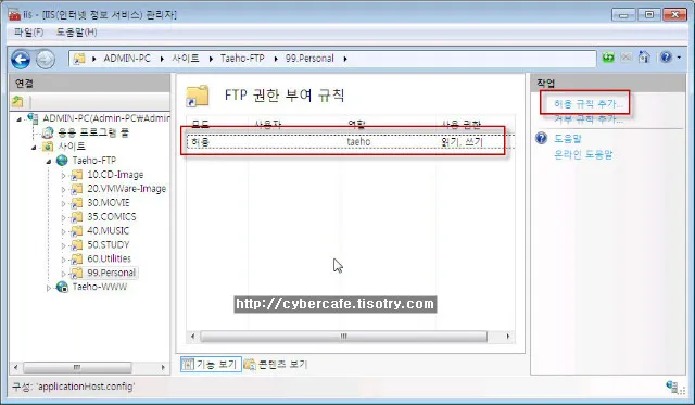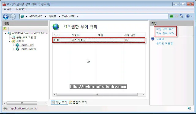 3. IIS 관리자 창에서 FTP서버와 특정 디렉터리에 “FTP 접근 권한 규칙”을 생성