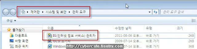 먼저 IIS 관리자를 실행하기 위해 “제어판”-“시스템 및 보안”-“관리도구”에 들어가서 IIS(인터넷 정보 서비스) 관리자”를 실행합니다.