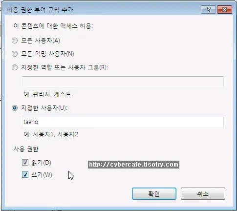 이 창에서 “지정한 사용자”에 앞에서 만든 계정의 ID를 입력하면 됩니다. 그리고 사용 권한에 읽기와 쓰기를 모두 체크하면 다운로드 및 업로드 권한을 모두 갖게 됩니다.