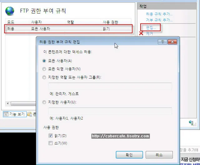 위의 화면에서 “모든 사용자”와 “모든 익명 사용자는 다릅니다. 모든 사용자는 “FTP서버에 계정을 갖고 있는 사용자 모두”를 의미하고 모든 익명사용자는 FTP에서 말하는 “anonymous(익명,로그인 하지 않고 접근하는 모든 사용자)”를 의미합니다.