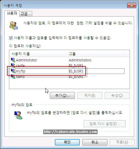 아래의 경우 IIS 웹서버 및 FTP서버에서 사용자 인증에 사용될 계정이 3개가 생성되어 있습니다.
