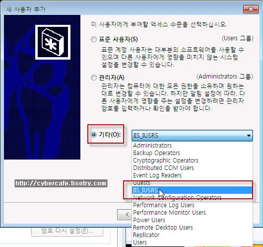“다음” 버튼을 눌러 생성할 계정의 그룹을 “IIS_IUSRS”로 입력합니다.