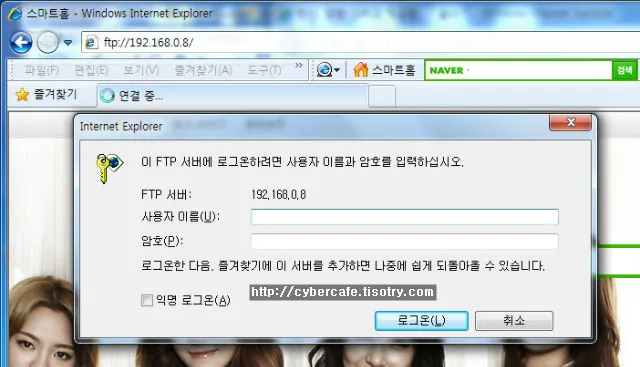 위의 화면과 같이 권한 부여 규칙을 만든 뒤 웹 브라우저에서 ftp://Ipaddress 와 같이 접근하면 아래처럼 로그인 창이 먼저 실행됩니다.