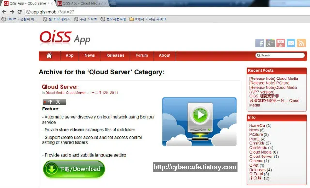 큐라우드 서버는 다음의 웹페이지에서 다운로드 받아 설치하면 된다. (http://app.qiss.mobi/?cat=27)