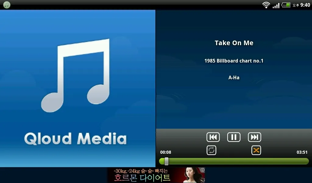 Music 이라는 이름으로 등록된 폴더에 들어가 MP3를 스트리밍하여 들어보면 다음화면과 같이 재생된다. 1980년대 빌보드 차트 1위곡 모음 폴더에서 실행해 보았다. 화면 하단의 셔플 버튼을 눌러 놓으면 해당 폴더의 음악이 랜덤하게 순차적으로 재생된다.