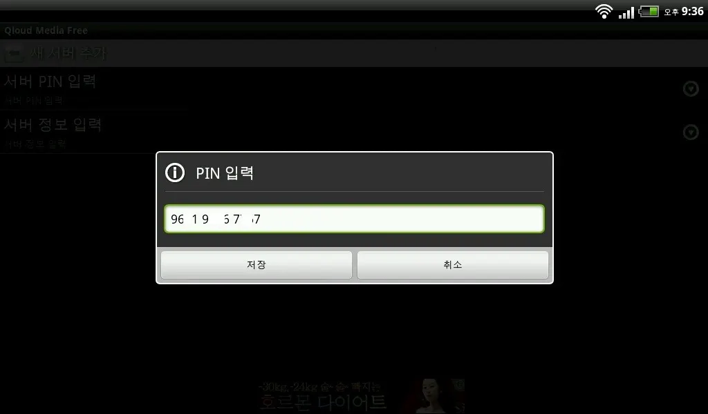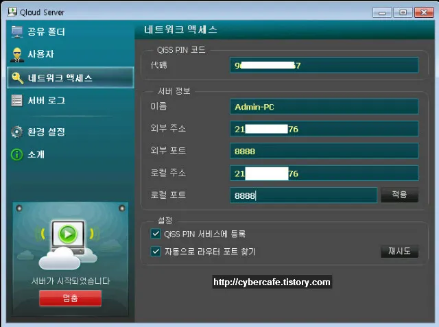 큐라우드 서버의 “네트워크 액세스” 항목 설정 시 생성된 PIN 번호를 입력한다.