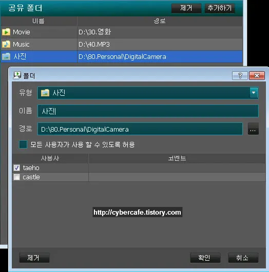 각각의 공유폴더를 등록하고 폴더별로 접근 허용 계정을 지정하여 접근을 제한할 수 있다.