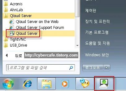 큐라우드 서버를 설치하고 나면 PC에 다음과 같이 프로그램 그룹이 생성된다. Qloud Server 를 실행하면 아래 화면과 같이 서버가 실행되고 상태바에 표시된다.
