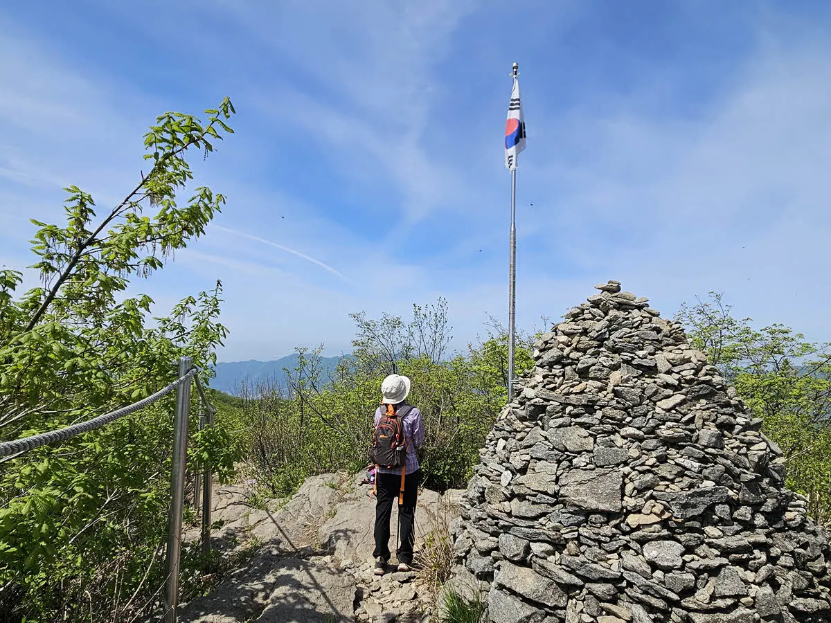너덜길이 끝나면 바로 정상이다. 그리고 축령산 정상엔 태극기가 게양되어 있다. 정상은 해발 887m.