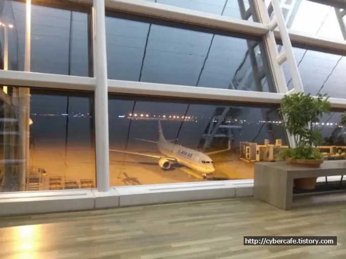 출발시간은 새벽 1시30분 .. -.- 국내선에나 취항할 법한 가장 작은 보잉기… 기내식도 주지않은 완전 저가항공편이다. 하지만 무늬는 대한항공의 대한민국 국적기.. 승객은 거의 만석… 빈자리를 찾기 힘들정도로 많았다.