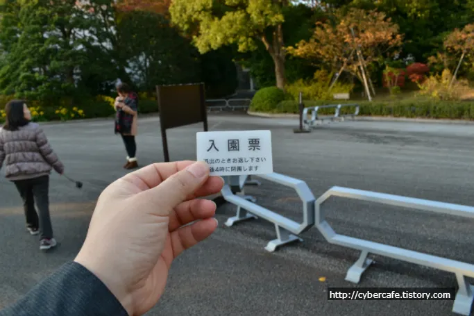 그리고 이 교코가이엔의 입구 (오테마치역쪽)에서 아래와 같은 표찰을 받고 입장하여 다케바시역 쪽 출구(반대로도 가능)에서 표를 반납하고 나가도록 되어 있다.