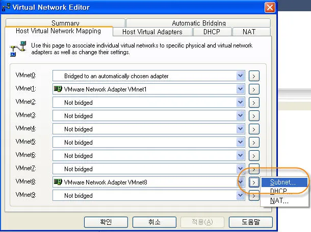 4. “Host Virtual Network Mapping”메뉴에서 VMNet8의 오른쪽 꺽쇠버튼을 누르면 나오는