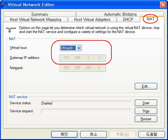 이때 VMNet8번이 기본적으로 NAT에 사용되도록 지정되어 있으므로 그냥 8번을