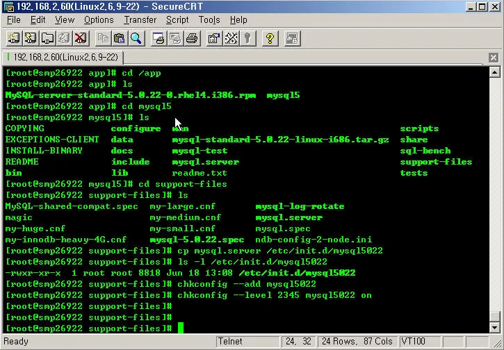 4. chkconfig –level 2345 mysql5022 on 명령을 실행하여 mysql을 runlevel 2,3,4,5에서 실행하도록 설정한다.