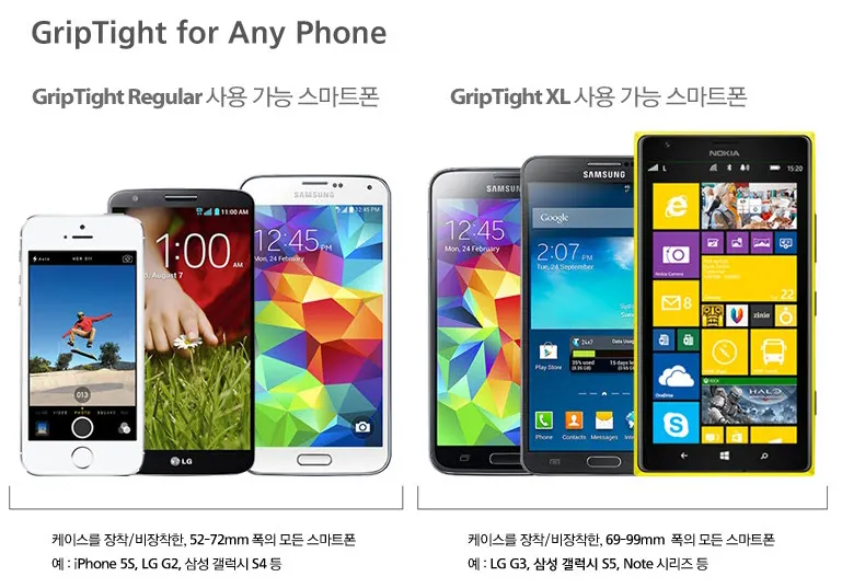 Joby GripTight Stand는 두 가지 규격이 있다. 스마트폰을 잡아주는 암의 크기를 잘 보고 구입해야한다. 아이폰5s가 거치가 되는 작은 규격과 큰 규격이 있다. XL이 붙은 제품이 폭이 큰 스마트폰을 거치할 수 있다. 암의 최소/최대 폭이 다르므로 주의해야 한다.