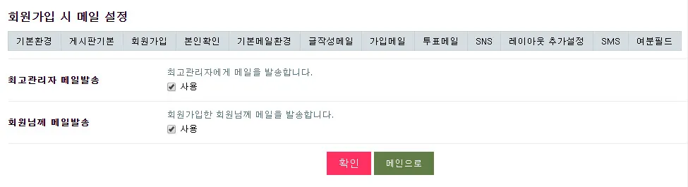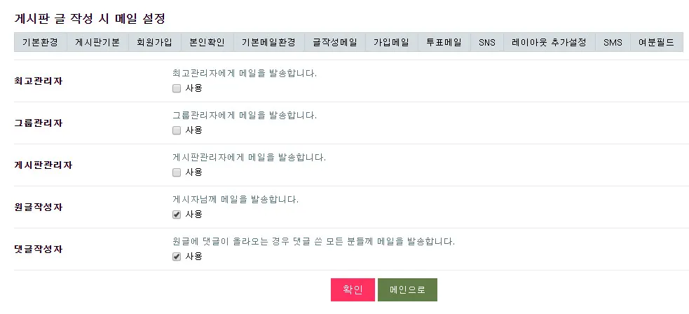 위 설정화면에서 처럼 회원가입한 사람이 있으면 등급설정을 위해 관리자에게 회원가입 신청이 있음을 알려주는 설정을 비롯해 글쓴이에게 댓글이 작성되었음을 알려주는 등 다양한 용도로 메일 발송기능을 사용할 수 있습니다.
