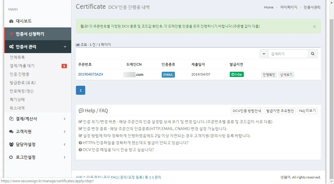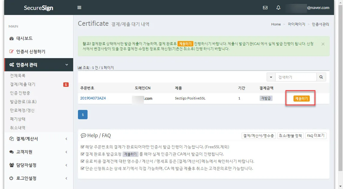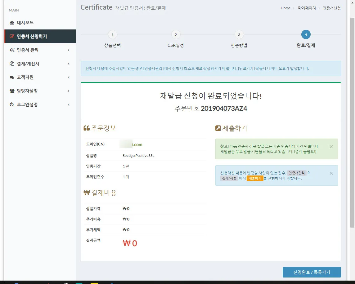 위 화면처럼 주문번호와 도메인(CN)이 보이고 “제출하기” 버튼이 표시되어 있다. 제출하기를 누르면 실제 인증서 발급과정이 진행된다.
