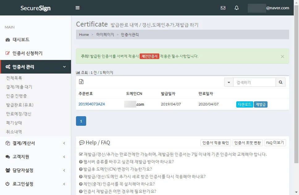 다음단계로 넘어가면 인증서 신청은 완료된다. 아래 화면의 경우 재발급을 신청한 경우다. 재발급 과정도 마찬가지 과정을 거친다. 1년 내에는 무제한으로 재발급을 받을 수 있다.
