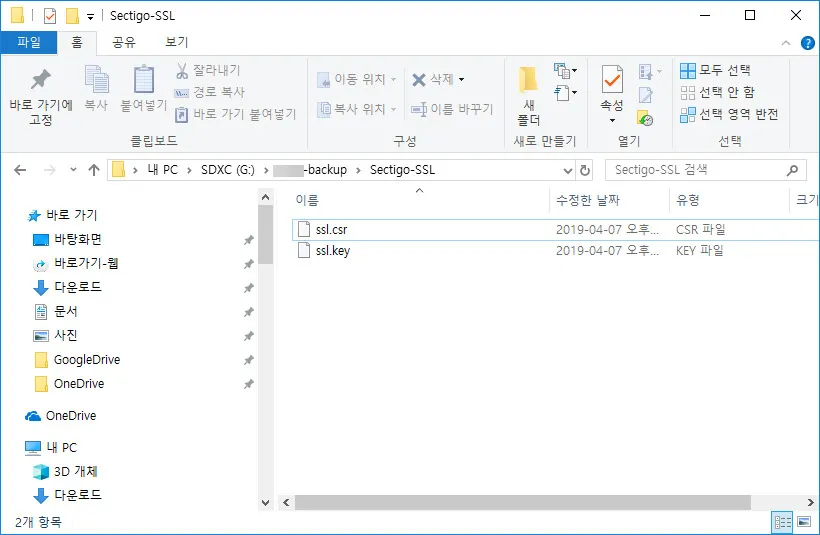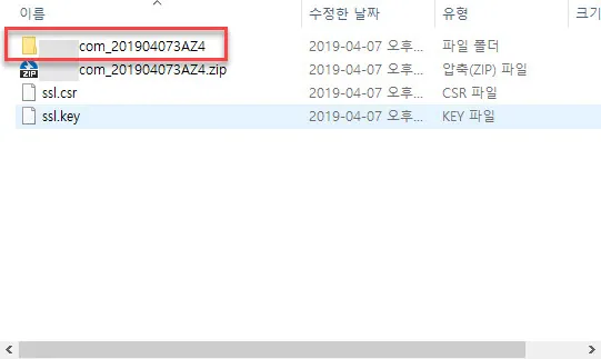 아래는 다운받아 노트북PC에 저장한 화면이다. ssl.csr이 공개키와 도메인정보가 포함된 CSR파일이고 ssl.key가 개인키다.