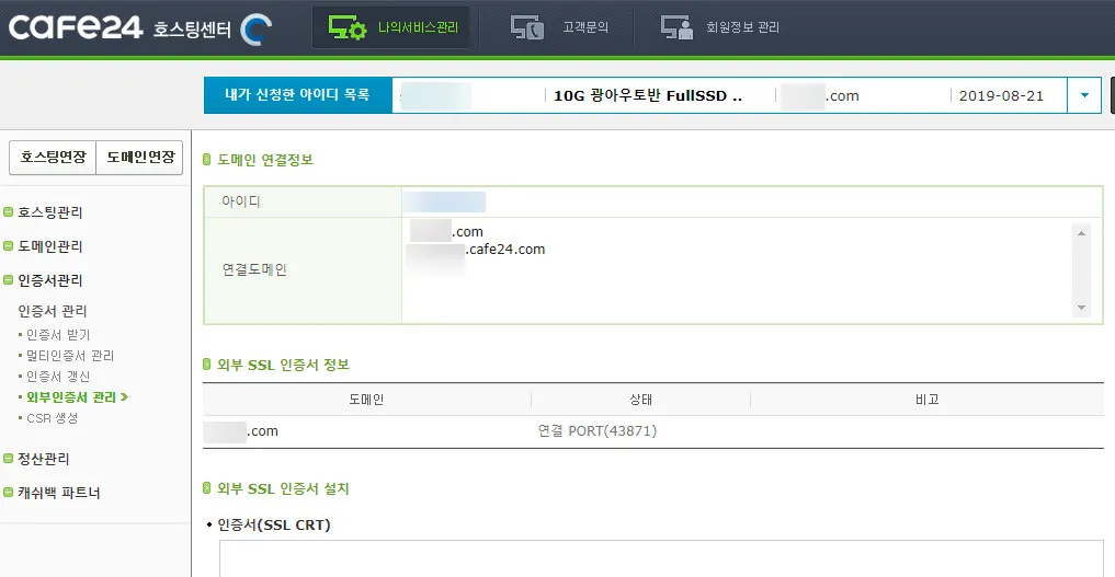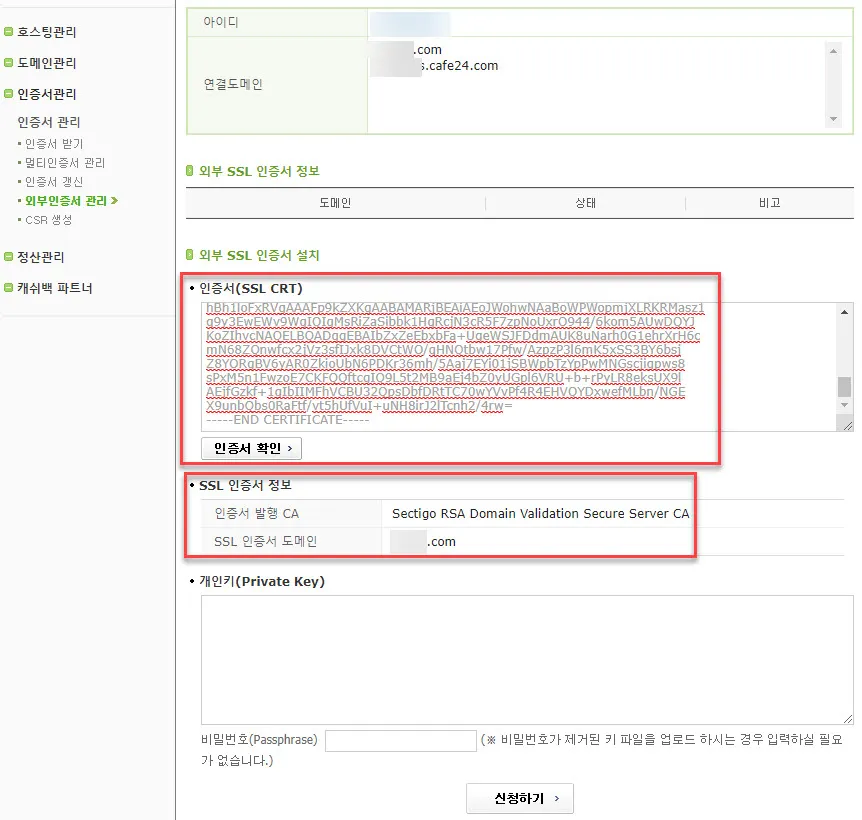 복사한 내용은 카페24의 “인증서관리” – “외부인증서 관리” 메뉴로 가서 “인증서(SSL CRT)”항목에 붙여넣기한다.