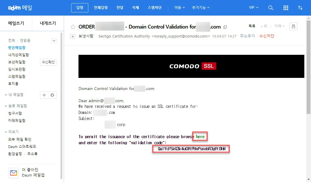 이 경우 다음의 스마트워클을 통해 인증메일을 받은 화면이다. 도메인을 Cafe24에서 구입했고 구입한 메일의 메일주소를 다음 스마트워크를 통해 관리하고 있기 때문에 메일화면이 다음메일 환경이다.