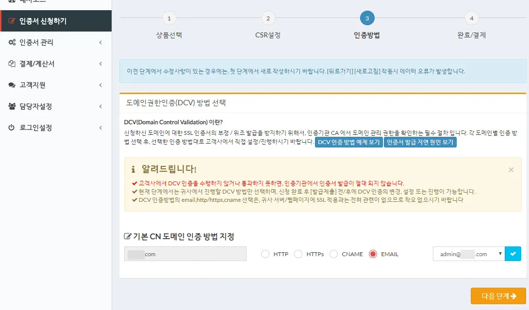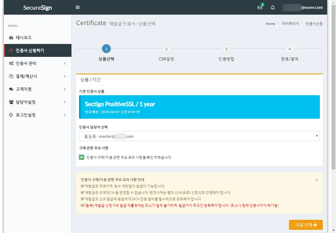 위와 같이 신청하고자 하는 도메인의 인증서 담당자를 선택해야 한다. 메일주소가 실제로 존재하는지 꼭 확인해야 한다.