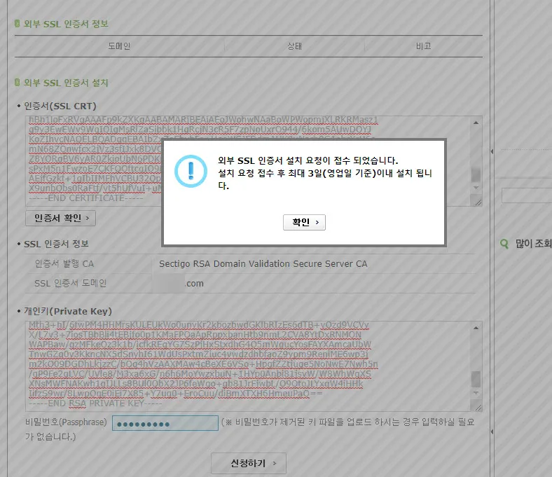 그리고 화면 하단에 있는 신청하기 버튼을 누르면 아래 처럼 SSL 인증서 설치 요청이 접수된다.
