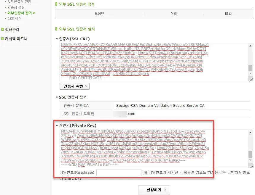 그리고 아래와 같이 “개인키(Private Key)” 입력창에 붙여 넣는다. 비밀번호에는 CSR 생성 시 입력한 비밀번호를 넣는다.