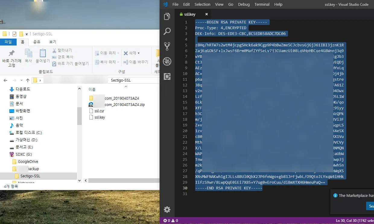 다음은 개인키를 복사해 붙여넣어야 한다. 처음 카페24에서 다운로드 받은 CSR과 개인키(key) 파일에서 ssl.key 파일을 노트패드로 열고 전체를 선택해 복사한다.