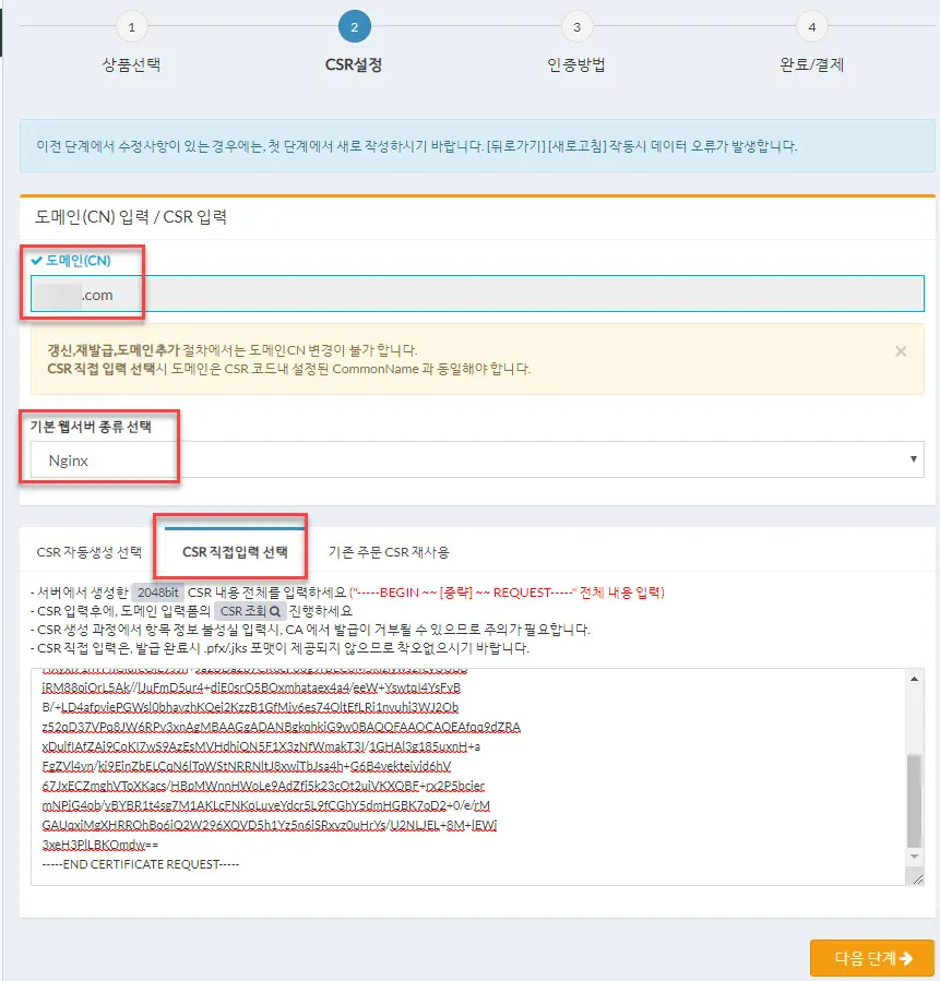 그리고 CSR은 CSR직접입력을 선택해야 한다. 그리고 앞의 CAFE24 CSR생성 과정에서 다운로드 받은 두개의 파일 중 ssl.csr을 노트패드 등으로 열어 전체를 선택한 뒤 위 화면처럼 붙여넣는다. —–BEGIN 부터 REQUEST—–까지 모두 선택해야 한다.