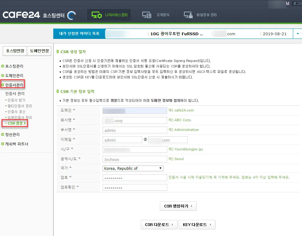 먼저 내 호스팅 사이트에서 도메인 소유자의 신원정보를 입력하여 개인키와 CSR(Certificate Signing Request)을 생성해야 한다. CSR에는 도메인에 대한 정보와 공개키가 포함되어 있다.