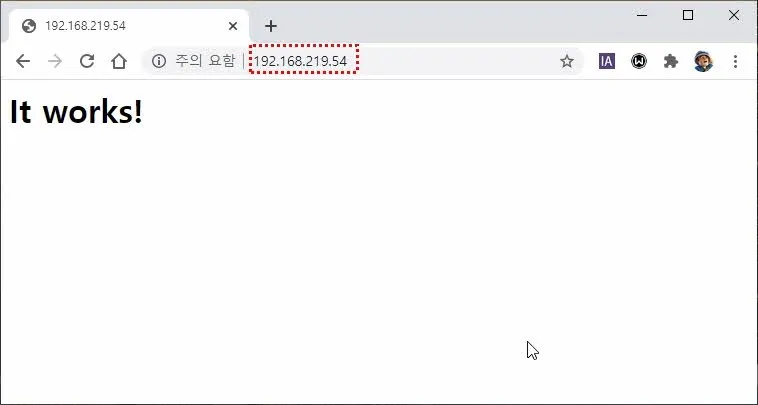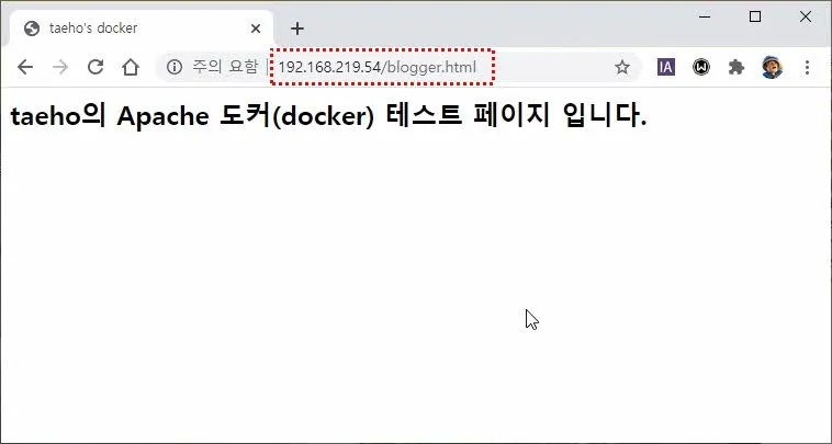 이제 외부에서 이 컨테이너에서 실행중인 Apache 웹서버에 접속해본다. 컨테이너가 실행중인 호스트의 IP를 브라우저에 입력해본다.