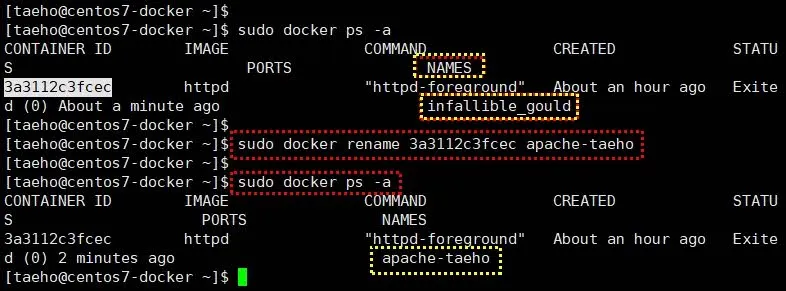 만약 컨테이너의 이름이 맘에 들지 않는다면 아래 명령을 통해 컨테이너의 이름도 변경할 수 있다.