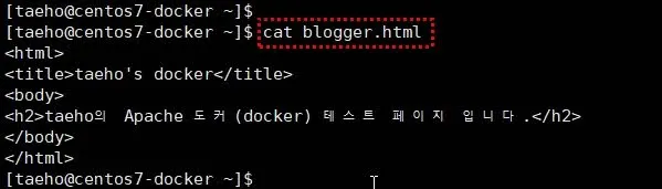 호스트인 centos7-docker 에서 아래 화면처럼 전혀 다른 html 파일을 하나 만든다. 이 포스트에서는 blogger.html 이라는 html 파일을 만들었다.