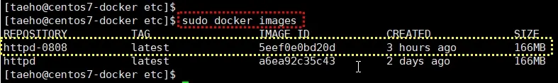 다시 도커 이미지 목록을 보면 생성된 새로운 도커이미지(이름 : httpd-8080)가 보이는 것을 알 수 있다.