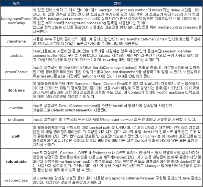 관련 server.xml의 설정은 아래표를 보고 공부해야 한다.