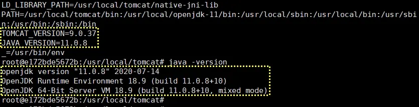 Tomcat Container에 접속한 쉘에서 env 명령을 실행해보면 Tomcat Version과 Java Version을 확인할 수 있다.