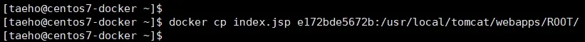 호스트에 생성한 index.jsp를 docker cp 명령을 이용해 Tomcat 도커 컨테이너 내부의 DocumentRoot에 해당하는 appBase 또는 docBase에 복사해 넣는다.