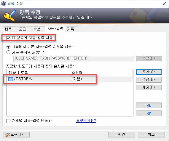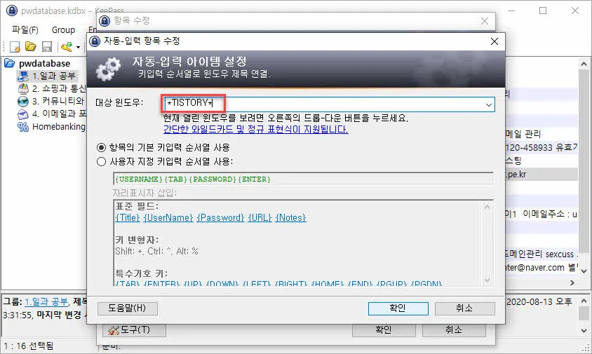 아래 화면이 티스토리 블로그의 ID와 비밀번호 그리고 앞에서 등록한 Auto-Type이 설정되어 등록된 화면이다.