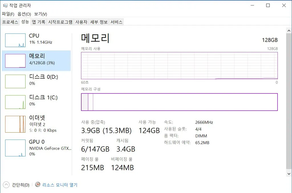 내컴퓨터(내PC)의 등록정보를 보면 램이 128GB로 잡힌다. (시스템 – 설치된 메모리(RAM) 항목)