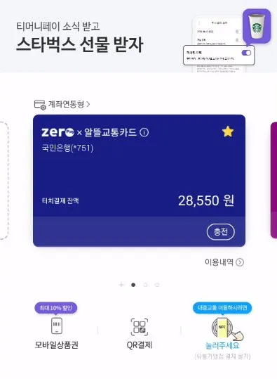 먼저 티머니페이 앱에 다음과 같이 “Zero Pay x 알뜰교통카드”를 발급받고 계좌를 연결해 선불 충전을 한다. 자세한 방법은 이전에 올린 포스트를 참고하면 된다.