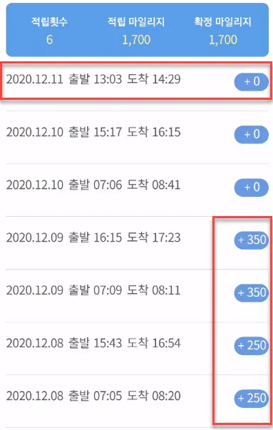 그리고 12월 7일의 적립 내역은 보이지 않지만 12월 8일과 동일한 구간으로 움직여서 동일하게 250마일 씩 2회가 더 적립되어 있다.
