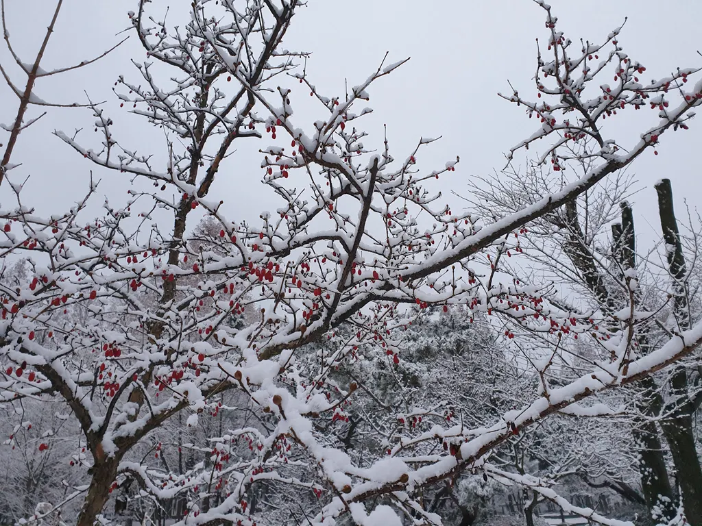 빠알간 그 산수유열매가 열린 가지에 눈이 쌓였다.
