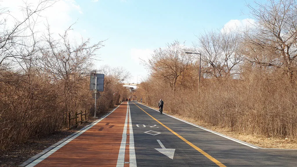 그리고 나면 바로 가양대교를 건너야 한다. 이 한강 북쪽 둔치길에 가양대교 하류쪽 인도로 올라가는 엘리베이터와 계단이 있다.