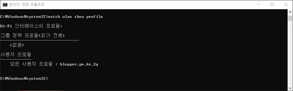 이 명령을 실행하면 접속하기위해 등록한 무선랜 프로파일들의 목록이 보인다. 위 화면에서는 blogger.pe.kr_2g 라는 무선랜 하나만 등록되어 있는 화면이다.