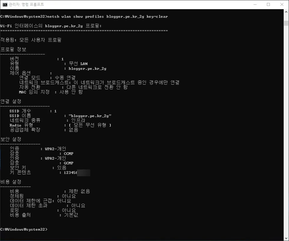 그리고 netsh 명령어를 사용하면 등록되어 있는 무선랜 프로파일의 보안설정도 확인할 수 있다.