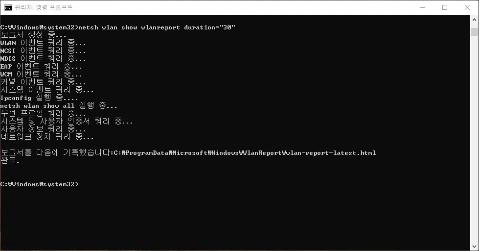 이 명령어를 실행하면 무선랜 접속/종료 시간 차트와 무선랜 어댑태 목록, 현재 등록되어 있는 무선랜 프로파일의 목록, 현재 등록여부와 관계없이 접속했던 무선랜의 이력로그와 에러기록이 모두 HTML 보고서 파일로 생성된다.